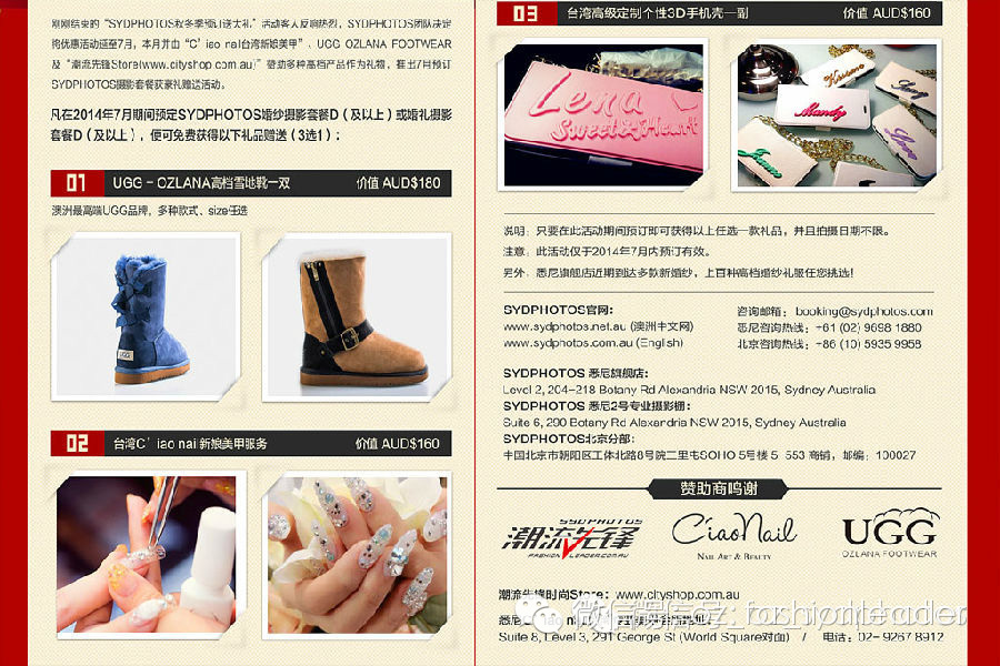1. UGG -OZLANA高档雪地靴一双(澳洲最高端UGG品牌,多种款式、size任选) – 价值 AUD$1802. 台湾C’iao nail新娘美甲服务价值 AUD$1603.台湾高级定制最Hit个性3D手机壳一副价值 AUD$160