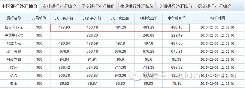 根据最新中国银行外汇牌价显示,2015年2月3日,澳大利亚的现汇买入价位477.93(人民币),现汇卖出价位481.29。可以说是澳币兑换人们币的历史最低点。简单点来说,就是人民币在澳大利亚更值钱啦!一直想去澳洲旅游的小伙伴们,赶紧约吧!