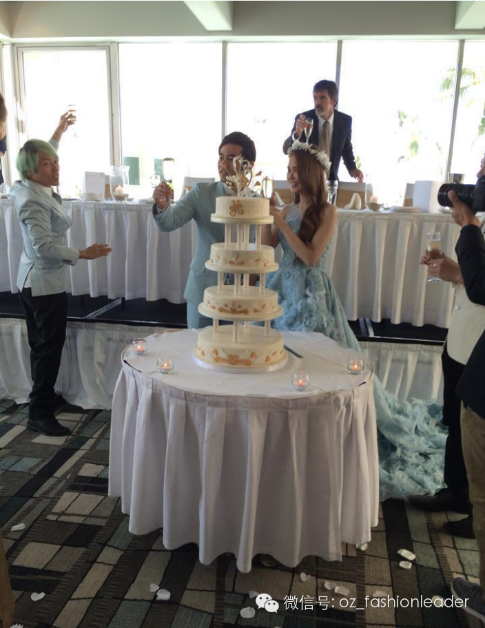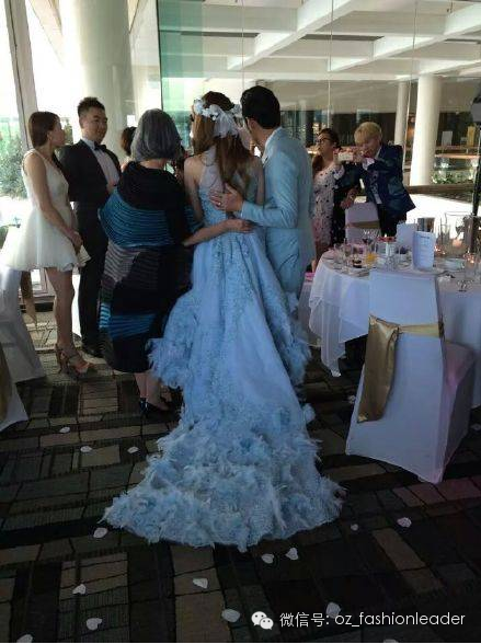 婚宴现场,也是采用湖水蓝色布置,显得梦幻十足。两人装束虽不华丽,但更多了 一份温馨。湖水蓝这是这次婚礼的主打色,小编预测2015年婚纱的流行色肯定少不了湖蓝色。