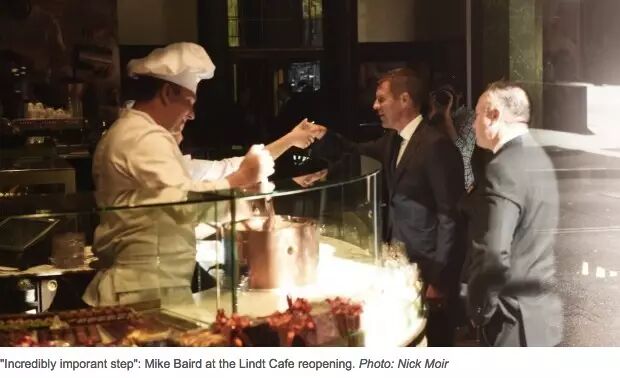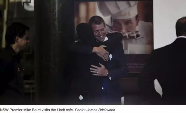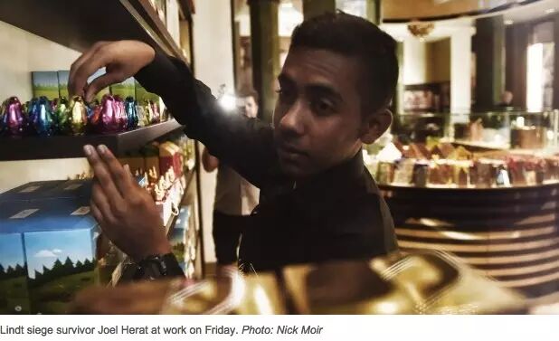 Joel Herat(下图一)——劫案中逃生的服务员,现在他又回到了他所熟悉的工作岗位。悉尼时间九点半,新南威尔士州州长Mike也到访Lindt Cafe,他对Joel Herat说:整个城市都为你而骄傲!尽管经历了这一切,但你还是一个坚强的人!(下图二)