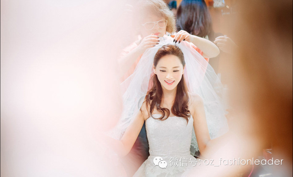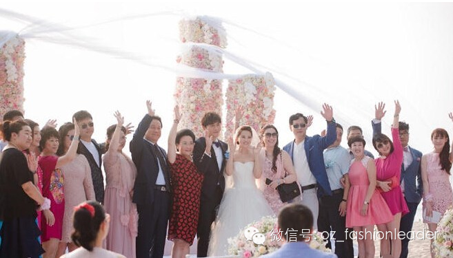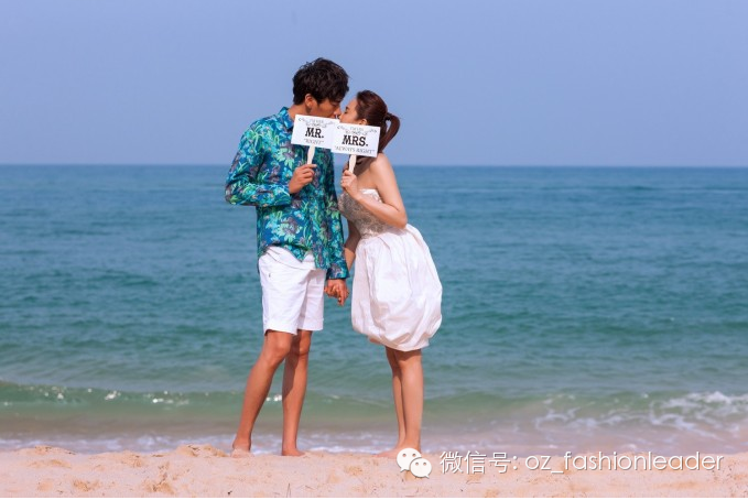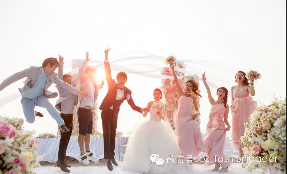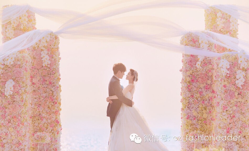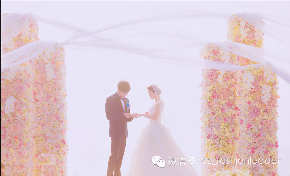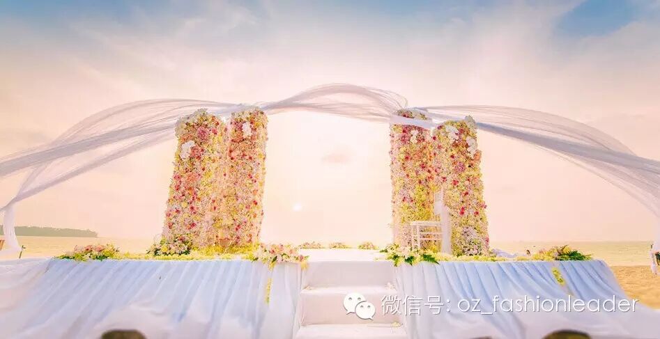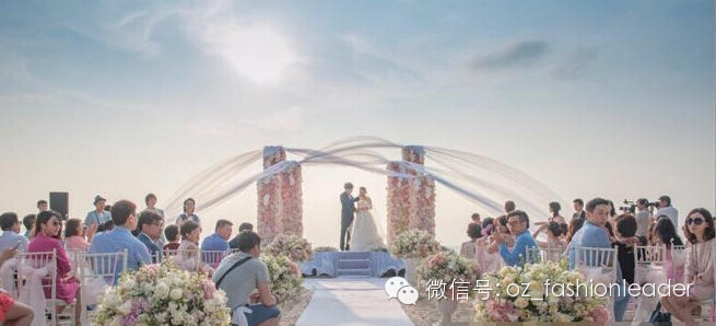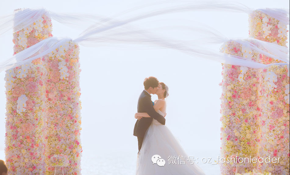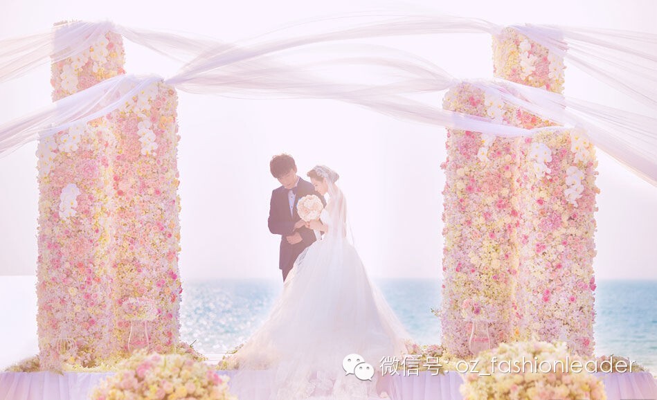 海面夕阳渐渐落下,波光粼粼,新娘长达数尺的头纱在风中飘起,神圣又梦幻的氛围,多么幸福的画面!