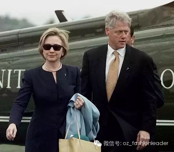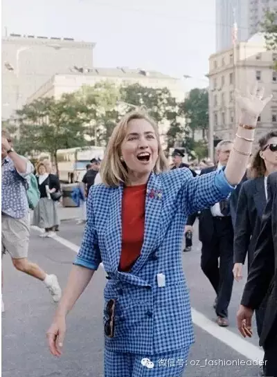 现如今玩的撞色希拉里早在20年前就已经玩过了,蓝色格纹西服套装搭配红色T恤,撞出时髦感,即清新又干练,另外,搭在西装上的墨镜,胸针等配饰也为造型加分,这完全就是希拉里演绎的潮人街拍。