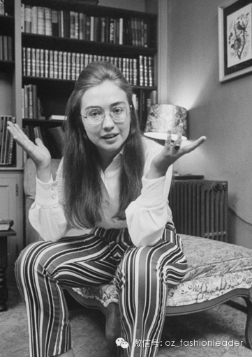 20世纪60年代还在读大学时的希拉里,有着一个与年龄不相符的外形。草堆般的厚重长发配着一副大框镜,穿着一双充满男人味的凉鞋,还有她那条夸张的“条纹长裤”,画面很是搞笑。