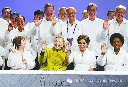 在这次会议合影中,其他参会人员们几乎全穿白色上衣,但唯独希拉里穿着一身黄绿色上衣坐在前排…