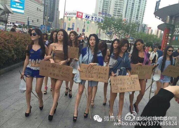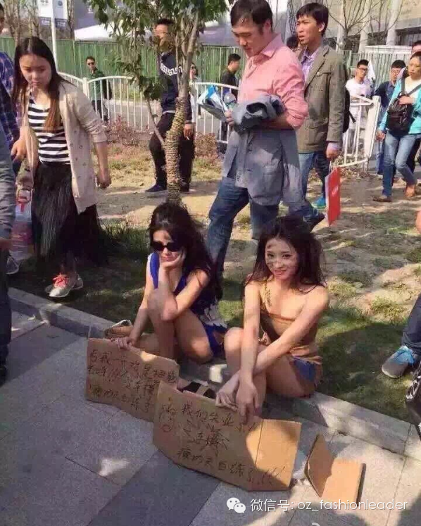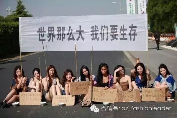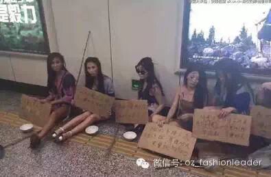 一大波美女车模打扮成乞丐,在上海徐家汇街头乞讨,以抗议车展拒绝车模导致自己失业。