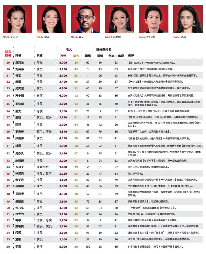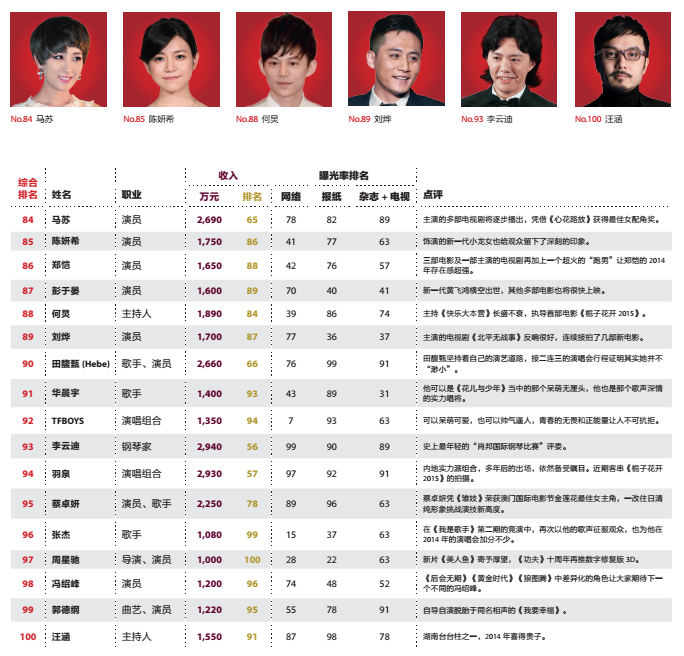 今年榜单上,女王范冰冰位居榜首,这也是她连续三年摘得福布斯中国名人榜桂冠。随着电视剧《武媚娘传奇》的热播、电影《万物生长》的上映、综艺节目《出彩中国人》和《奔跑吧兄弟2》等综艺带来的高曝光,势必会让范冰冰再次“霸占”荧屏。