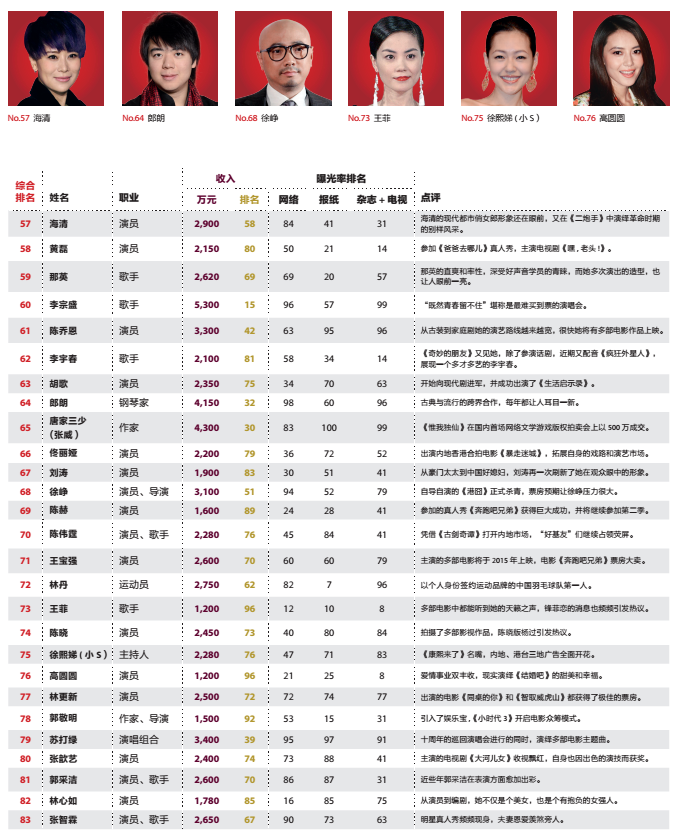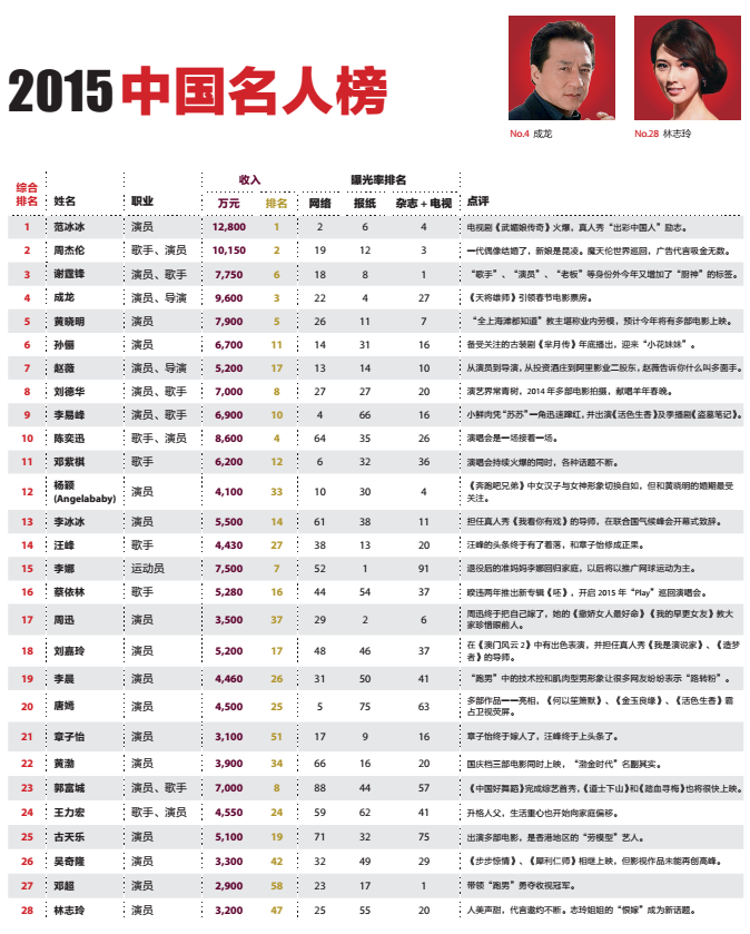 2015年5月11日,福布斯中文版推出“2015年中国名人榜”,范冰冰连续三年摘得桂冠,准爸爸周杰伦位第二,谢霆锋居第三。在今年首次上榜的15位名人中,“小鲜肉”占有绝对优势,共有9人上榜。