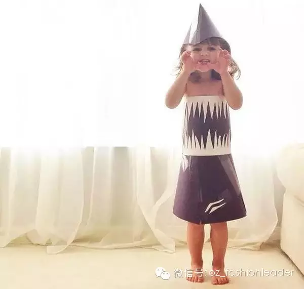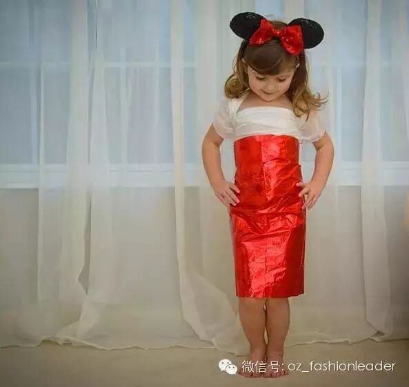 上图中小萝莉身穿的“时装”就是她的处女作,完成该作品时,小姑娘只有四岁。这件衣服基础材料为硬纸张,另加胶带、粘合剂,全手工私人订制,举世无双,全球限量仅此一件。