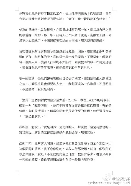 “不知道从什么时候开始,上台前会留出一小会儿时间来做几件事:洗手、刷牙、喷香水。这几件事很重要,重要到如果有一天因为来不及而略过了其中 一项,踏出侧幕的那一刻,会感到一丝隐隐的不安。细想想,这几件事的存在或许有它的原因。上台前,你会渴望告别生活中的自己,告别白天在现实生活里发生的一切。晚上七点半的身体本来正要进入自然放缓的节奏,可角色的世界需要在这时开启。这时,刷牙最能有效地唤醒我,让头脑集中。至于香水,应该来自一种对气味的依赖。其实每次接受采访,被问到‘记忆中最……的事情’都讲不出什么故事,因为脑子里只记得当时空气中弥漫着的气味。对我来说,气味有时会唤起似曾相识的感觉,能促进和角色之间的默契。因为这个,我会为不同的角色选择符合她们的香水。演《简爱》,我用一款陪了我15年的香水,独立果敢不甜腻,可能年头太长,闻到就会觉得:一切都在那儿,初心、归属。演《青蛇》用的是一款绿茶木味的,偏香、外放。演《活着》里的家珍,什么香水也不用。洗完手,带着满手香皂味上台,那是平常生活里天天会闻到的最朴实的味。2013年我有三部话剧巡演,不停地转换角色,这个方法算是帮了忙。”