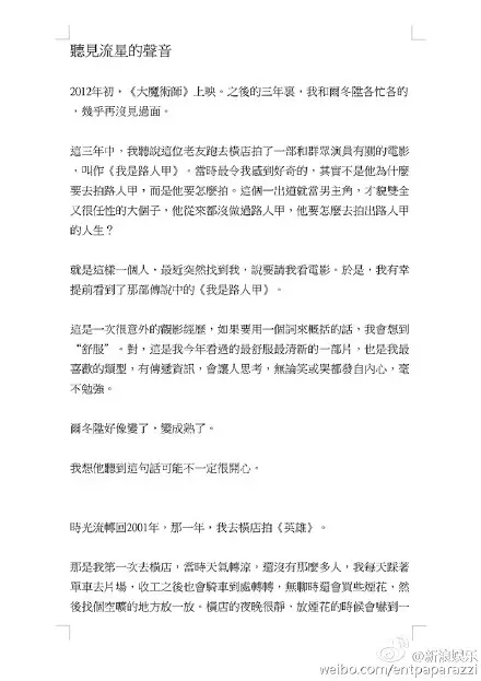 梁朝伟是香港影坛最具文艺气质的明星之一,一篇《听见流星的声音》令大家看到了他在出色演技之外的文字功底。据了解,该文章是梁朝伟在受邀观看了尔冬升执导的电影《我是路人甲》之后的真情流露之作,文中除了谈到自己对电影的见解外,还写下了当初在横店拍摄电影《英雄》时看狮子座流星雨的感受,并回忆了早年自己在老友周星驰的“洗脑”下,放弃卖家电的工作转而报考香港艺人培训班的故事。不少网友在阅读后感慨,文章“有种洗尽铅华后的平淡与细腻”,“文字美得不可思议,看完觉得整个世界都不浮躁了”。