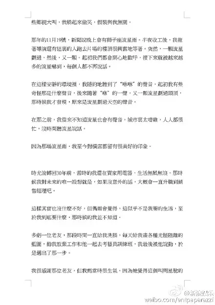 “我想即使到了九十岁,你应该还是跟现在一样,像个长不大的小老头,有点愤世嫉俗,满头银发,却还穿着短裤拖鞋自以为游走在不知名的星球吧。还记得你早当年奋力写书的模样,在光复南路的一家小店里,一壶茶,一包烟,握着笔一个一个字的写下。然后固定在傍晚时,身为助理的我去接你,前往录音室,再帮你把一张张的文字打进计算机里……”