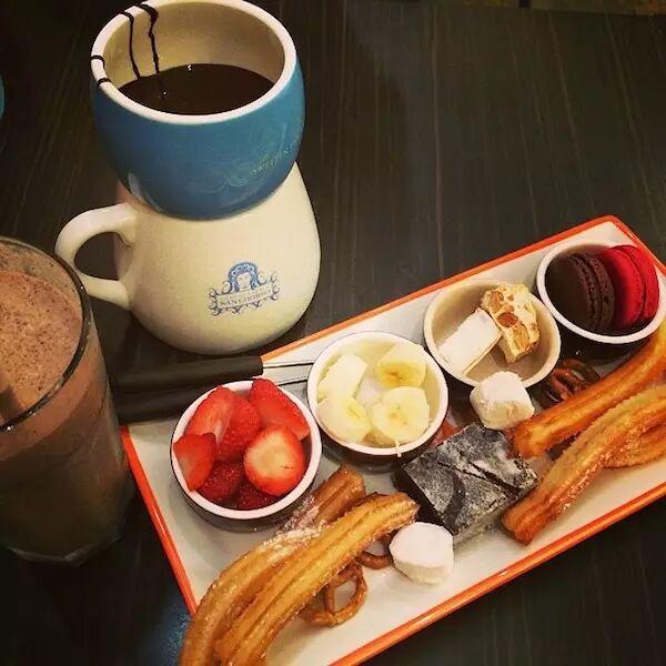 西班牙最为人知的甜点就是吉拿棒(Churros)了。炸的金黄酥脆的吉拿棒再蘸上浓滑的热巧克力,黑巧克力滑顺了吉拿棒的外表,沾酱苦中带甜的滋味令人回味无穷。觉得只吃吉拿棒有点单调?别担心,Classic Fondue for Two 提供了当季水果、棉花糖、马卡龙以及小饼乾,将这些小物蘸上用着小蜡烛加热的巧克力酱,夜裡的甜点果然不能少了巧克力的陪伴。