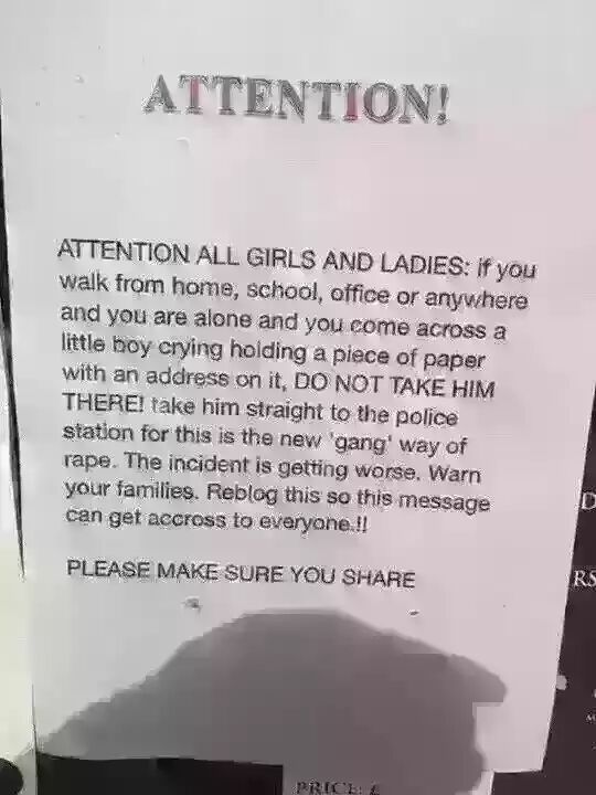 内容为:女生和女士们请注意,如果你独自上班、上学、或者去任何地方的途中,遇见一个在哭的小男孩,手里拿了张纸(纸上有个地址),请不要带他去到地址所在地!直接带他去警局。因为这是新的团伙强·奸·手段。这事件已经越来越严重。请警告你的家人,或者通过社交网络传播给更多人知道。