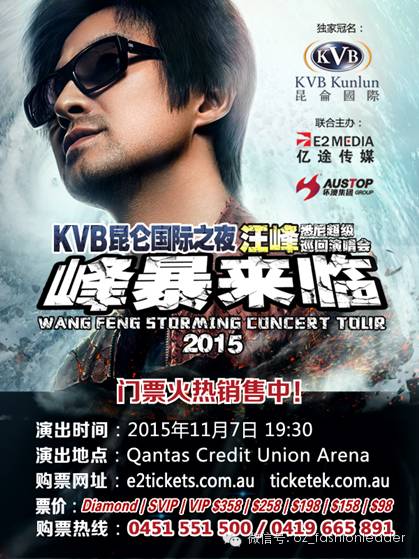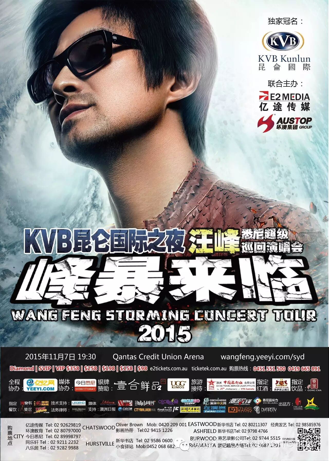 汪峰“峰暴来临”巡演是中国内地歌手第一次公布与欧美顶级制作团队的合作,共计四十余个城市,累计观众人数超二百万人,也是内地乐坛有史以来最大规模的巡演。两个月后,汪峰将携自己本轮在内地巡演的原版团队飞抵悉尼。一次颠覆乐坛的音乐之旅,一场撼动人心的摇滚史诗,就在2015年11月7日,Qantas Credit Union Arena, 峰暴来临,我们不见不散。