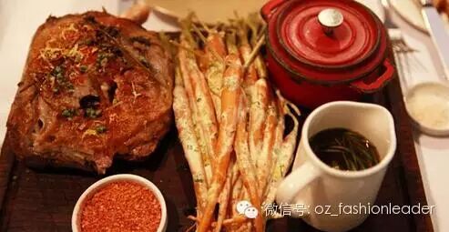 这家餐厅去年新晋升为两帽子餐厅,由此可见其日益高涨的人气。为了这道传说中的特色菜,我专程跑到悉尼Paddington区,刚开始走过安静的街区时还以为找错了地方,直到寻着隐约的嘈杂声进到餐厅一看,才发现酒吧区和正式用餐区竟然人满为患。一进店就能看到这道羊肘招牌菜作为特色菜写在黑板上,吃完前菜后,终于在满心期待中等来了真正的主角。当服务员把木板端上来的时候,超级大的分量让热爱肉食的我笑开了花,在诱人香气的引诱下大快朵颐起来。羊肉在各种香草小茴香的陪伴下,经过12小时的焖炖后变得异常“温柔”,轻轻一夹便从骨头上散落下来,丝毫不费劲。酥脆的外皮与软糯的羊肉形成了强烈的对比,丰富了口感层次。与羊肉一同呈现的还有迷迭香熬制的羊肘肉汤,可以搭配辣椒粉或是欧芹酱,各有各的风味。