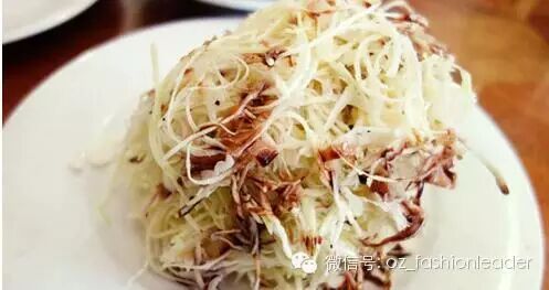 Andy Bunn,一位喜爱做意大利菜的英国人,因为对澳洲新鲜蔬果的着迷而搬到了悉尼。机缘巧合下,一对贩卖新鲜农产品的兄弟请Andy来照料他们蔬果商店楼上新开的咖啡厅,于是Café Sopra(意大利语中意为楼上)就这样诞生了。菜单都是由大厨精心拟定而成,充分利用售卖的新鲜蔬果和地道的意大利食材,同时还向食客出售进口的烹饪原材料。这道卷心菜沙拉,其原料嫩卷心菜由特定农场提供,新鲜到仿佛还能闻到泥土的气息。切得细如发丝的卷心菜叶饱含水分,加上3年历史的帕尔马干酪,以12年的陈酿香醋调味,苦味甜味酸味在口中飞舞回旋,受到众多食客的喜爱。清爽的口感搭配店里口味浓郁的意大利面或者甜味的奶酪饼都是完美的组合。