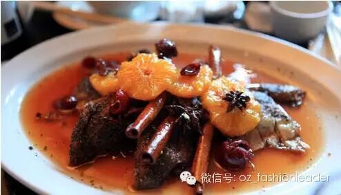 喜欢看美食节目的同学一定都知道Kylie Kwong——悉尼西式中餐的领军人物。作为第五代移民的Kylie从小受妈妈影响,喜爱烹饪粤菜,后来师从Neil Perry,学习西式料理手法。Billy Kwong“家常便饭”是她与Bill Granger共同开设的中餐厅,深受好评的小店几乎夜夜爆满。值得一提的是餐厅坚持走原生态路线,采用可持续性方式生产食材,所有家禽都吃牧草,以走地方式喂养。这道招牌香橙八角脆皮鸭颇有北京烤鸭或港式烧鸭的神韵,又进一步融入了西餐的调味手法。鸭子用丁香、肉桂、花椒、八角、茴香粉腌制过夜,入味后上笼蒸一个半小时,熟后入油炸至金黄,为鸭子增添了额外的香气与口感。最后浇上由肉桂棒、八角、茴香、橙汁、白糖、柠檬等熬成的酱汁,让水果口味很好地平衡了鸭肉的油腻,酸甜衬托椒盐真是妙不可言。鸭肉香嫩爽滑,肉汁四溢,就算搭配简单的白米饭,也能呈现出不可多得的好味道。