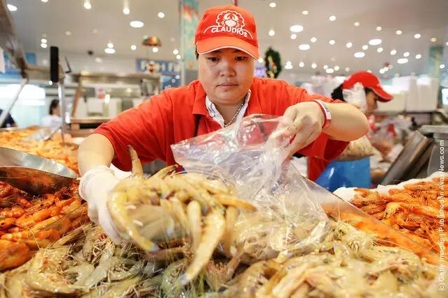 开始前繁忙的准备工作,各类海产品等待分箱~