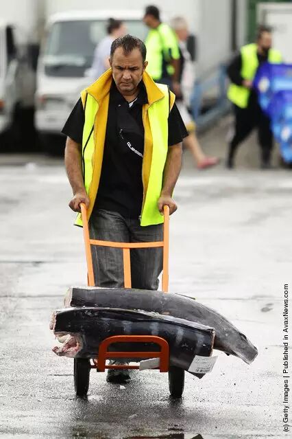 工作人员将海鲜送往各个相应商铺,哇,好大的鱼…..